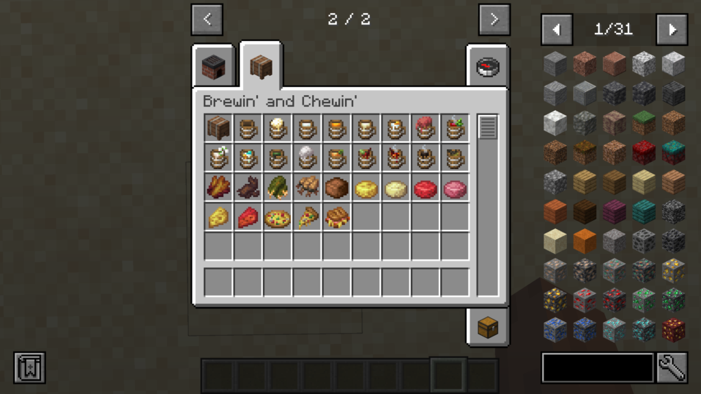 **Brewin’ and Chewin’(ブリューイン アンド チューイン)**は、マインクラフトに「飲み物」と「おつまみ料理」をたくさん追加するMODです。